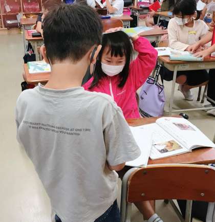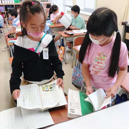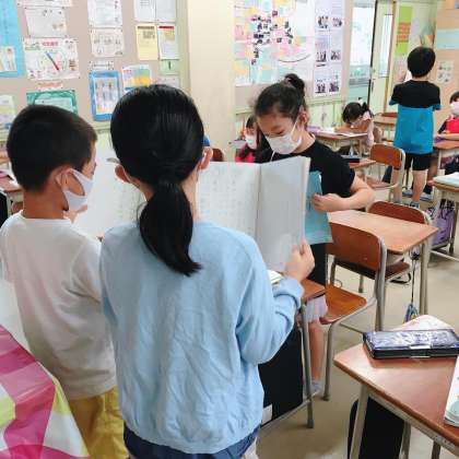 国語科では、「どうぶつえんのじゅうい」のお話を読んで、動物園の獣医さんの仕事に関するクイズを作っています。子供たちは、お話しを繰り返し読んで、クイズにしたらおもしろそうなところを探したり、質問の仕方や答え方を工夫したりしてできたクイズを出し合っていました。