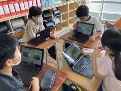 社会科では、まとめの学習でスライドを作りクラス内で発表したり、自分たちの発表動画を撮って見直したりしています。操作の仕方で分からないことがあっても、お互いに助け合う場面も多く見られます。