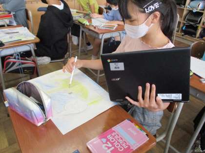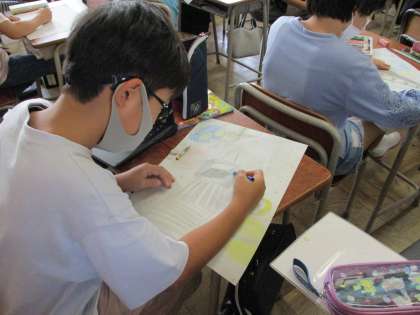図画工作科では、宮沢賢治の「銀河鉄道の夜」を絵に表しています。自分たちで考えた列車を描き、列車の配置や背景などの全体の構図を考え、少しずつ形にしているところです。子供たちは一つ一つこだわって、時間をかけながら製作しています。