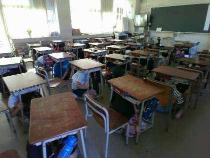 体が大きくなってきた子供たちには、机の下にもぐるのは、少し窮屈そうでしたが、じっと静かに放送を聞き、避難の準備をしていました。