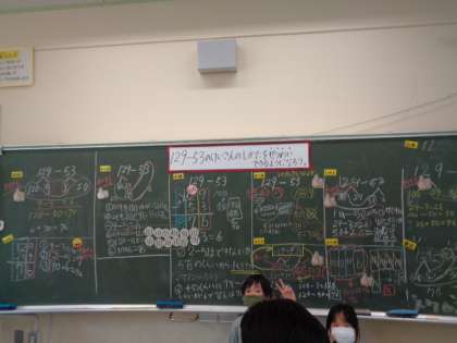 算数科の学習で、「129−53」の計算の仕方を考えました。子供たちは、これまでの学習内容を思い出したり、図にかいたりしながら、実に発想豊かに考えていました。一人一人の発表を真剣に聞く子供たちの姿がとても印象的でした。中には、これまで学習した「さくらんぼ算」「バナナ算」に自分で生み出した「じゃがいも算」などを使って説明する子供や「トリプルさんくらんぼ」という考え方を生み出している子供もいました。考える楽しさを味わうことができました。
