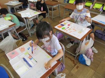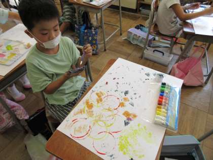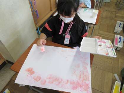 「うつしたかたちから」では、持ってきた材料を使ってスタンプしました。丸い形を集めて花のようにしたり、同じ材料でも使う角度を変えてスタンプしたりと、色々な工夫が見られました。