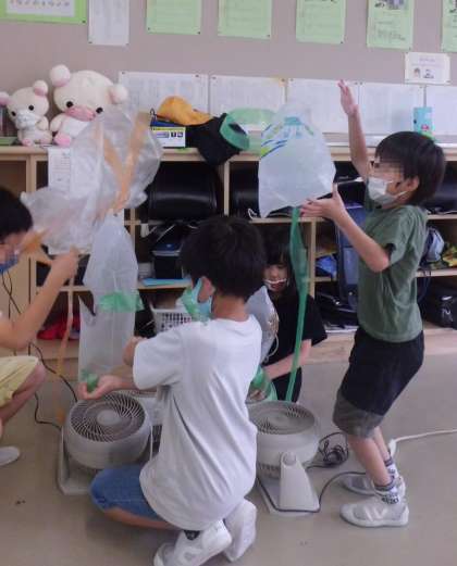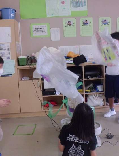 図画工作科「ふき上がる 風にのせて」の学習では、ふき上がる風の力で、うかんだりうごいたりするものをつくりました。うかんだり、うごいたりするようすに、大興奮!!「大きいふくろでつくったほうがいい!」「かるいふくろがいいよ」と考えて、工夫を重ねていました。本当に楽しいですね。