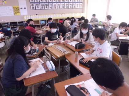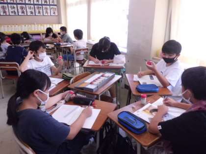 理科では地層の学習を行いました。標本をみながら、水の深さによって、砂や石、泥の様子が変わっていることを観察しました。