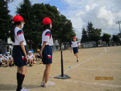 秋晴れの中、体育ではティーボールの学習がはじまります。