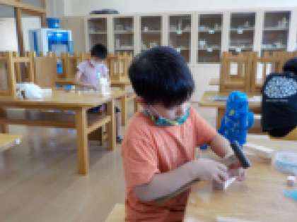 3年生は、はじめてのくぎうちに挑戦しています。金づちのの扱い方、くぎの打ち方を知り、思い思いの作品を仕上げています。はじめは、くぎがまっすぐに打てない、曲がってしまうと困っていましたが、回を重ねるごとに上達しています。仕上がりが楽しみです。