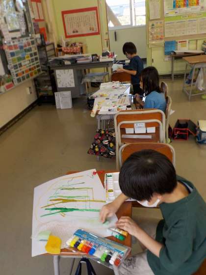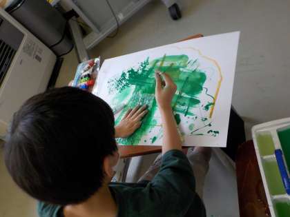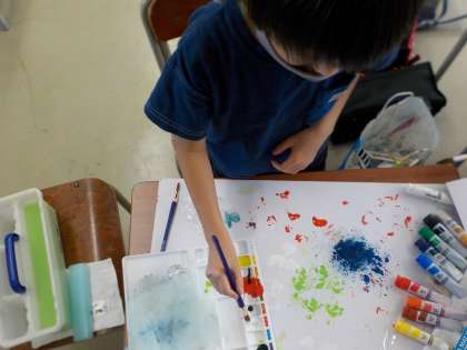 1年生は、家から持ってきたいろいろな材料に絵の具をぬって、その形を画用紙に写す造形あそびをしています。いろいろな形のスタンプを押す楽しさに夢中になっているうちに、すてきなもようができました。