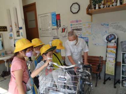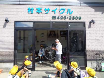 今日は、天気にも恵まれ、まちに待った「町たんけん」に行ってきました。赤コースは、「村本サイクル」とお菓子屋「TAKU」に行ってきました。村本サイクルでは、「いつから自転車やさんをしているのですか」や「一番高い自転車はどれですか」など、たくさんの質問が出ました。どの質問にも丁寧に答えてくださり、子供たちは驚いたり、感心したりしていました。修理の様子なども見せてくださり、子供たちは初めて知ったことがたくさんありました。