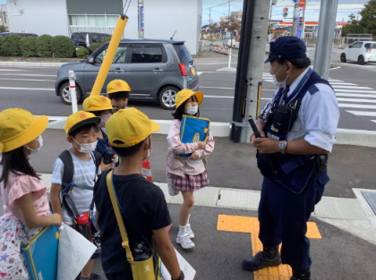 下堀交番では、「どこまでパトロールしていますか」や「どんな持ち物があるんですか」など、たくさんの質問が出ました。どの質問にも丁寧に答えてくださり、子供たちは驚いたり、感心したりしていました。警棒や手錠を触らせてもらったり、パトカーのなかを見せてもらったりと貴重な体験をしました。