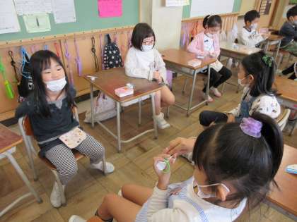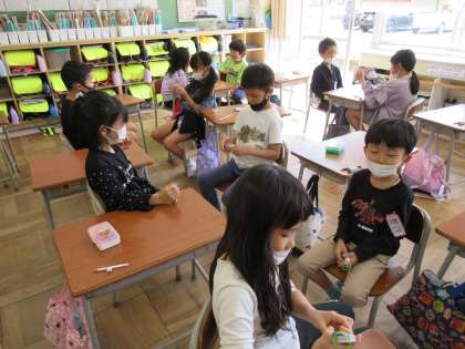 算数では、くり上がりのあるたし算を学習しています。今日は、計算カードを使って、一人で計算練習したり、ペアの友達と問題を出し合ったりしました。くり上がりのため少し時間はかかりますが、頑張っています。