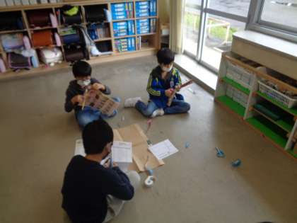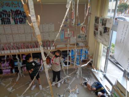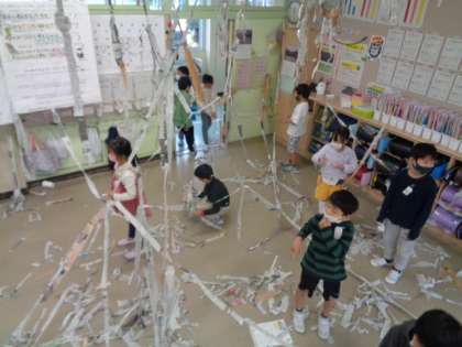 図画工作科の時間に「つないでつるして」の学習をしました。新聞紙を細長く切り、どんどんつなげていきます。いろんな友達と力を合わせて、どんどん長くなっていく新聞紙。廊下にまで出て、教室3個分の長さになるほどのものをつくっている子供たちもいました。輪っかにしたり、途中からつなげて分岐点をつくったりしながら楽しく取り組みました。「アスレチックみたい!」と完成に、大喜びの子供たちでした。