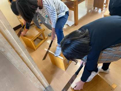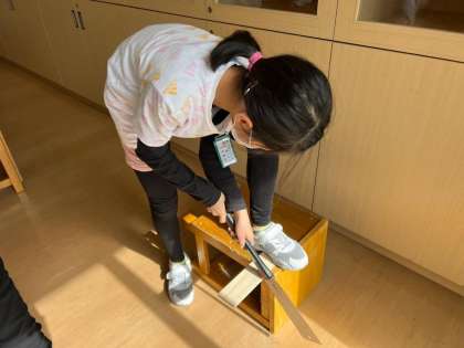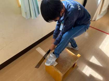 図画工作科の学習では、木を切って生活に役立つものを作る活動をしています。今日は、それぞれが書いた設計図にそって実際に木を切ってみました。初めて使うのこぎりに、初めは怖がる様子もありましたが、いざ使い始めると「切るのって楽しい!」「きれいに切れた!」などと、達成感を味わいながら活動することができていました。次の図工も楽しみですね。