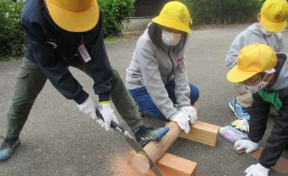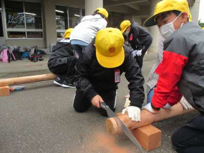 丸太を切るときには、引くときに力を入れることが大切だと言うことを教えてもらい、協力しながら一生懸命に切っていました。