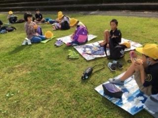 お昼タイムでは、爽やかな晴空の下で、おいしいお弁当を食べました。たくさん歩いてお腹を空かせていたので、一生懸命食べていました。