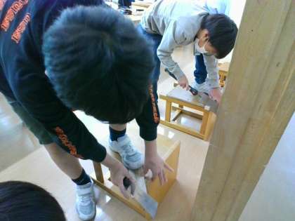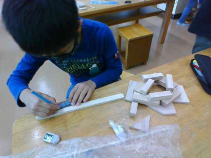 今日の図工では、先週に引き続きのこぎりで木を切りました。切った木を机に並べたり組み立ててみたりすることで、完成イメージを膨らませながら作業を進める子どもがいました。また、ペアで活動をする中で、互いにアドバイスをし合う姿も見られました。
