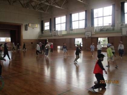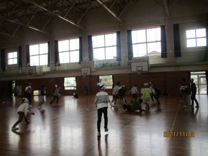 体育館の使える休み時間には、たくさんの子供達が体育館へ行き体を動かします。自分たちでルールやきまりを決めて、白熱したドッジボールが行われています。