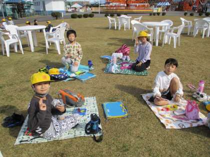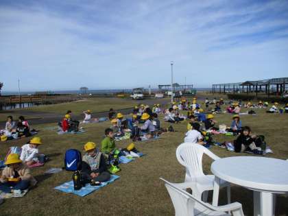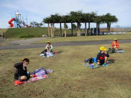 水族館でたくさんの生き物をみたあとの、昼食の時間の様子です。新型コロナウイルス感染症予防のため、食事中はしゃべらないなど制限がある中での昼食でしたが、天気のよいところでみんなで敷物を引いて食べるお弁当は格別に美味しかったようで、どの子も満面の笑みを浮かべていました。