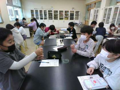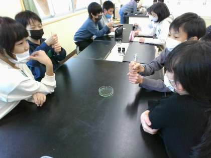 試験管に石鹸水の膜をはり、試験管を握るとどうなるかの実験を行いました。にぎると…また、手を離すと…?とても大きな変化がありました。「なんでこうなるんだろう」と、疑問が生まれたようです。