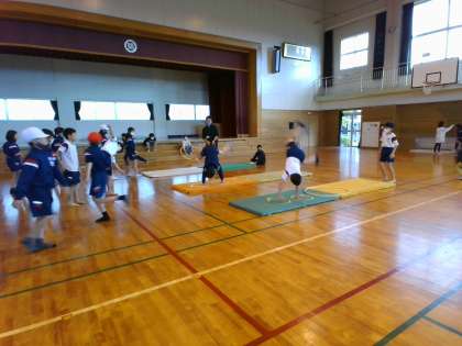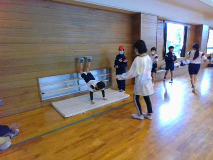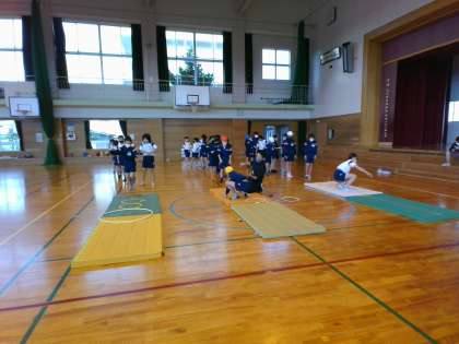 4年生のマット運動の学習では、前転、後転に加え、まず側転が加わります。子供たちは手の付く位置や足の伸ばし方、体の向きなどに気をつけて練習をしています。