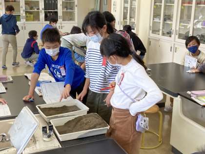 理科で流れる水のはたらきについて、実験を行いながら学んでいます。
