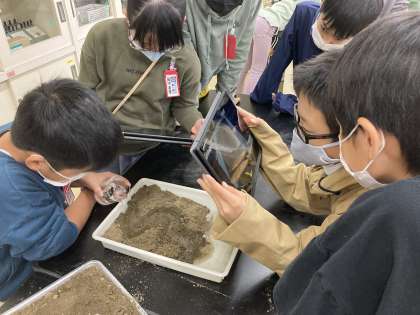 傾きを変えたり水の量の変えたりしながら、しん食や運ぱん、たい積のはたらきについて知識や考えを深めていました。模型を使った実験を通して、自分たちが住む富山の地も、長い時間をかけて土地の様子が変化してできたのではないかと考えている子どもたちもいました。