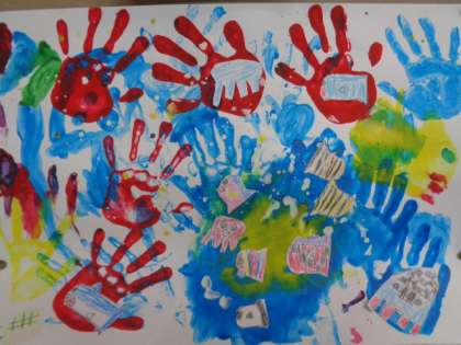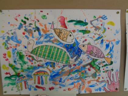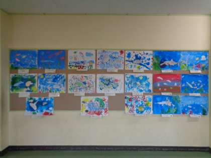 とろとろ絵の具をつかって描いた作品が完成しました。海の中を想像して、いろいろな魚を泳がせました。いろいろな海のイメージがあり、子供たちのよさがそれぞれ生きる作品が並んでいます。