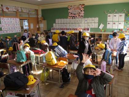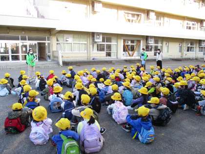 朝の様子です。出発式では上手に先生のお話を聞くことができました。