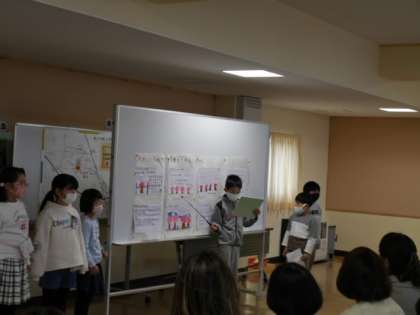 今日は3年生の学習の発表でした。総合で学習を進めてきた「蜷川のすてき探偵団」の発表会を行いました。これまで、地域の方々から話を聞く中でたくさんのすてきを見つけたことをポスター、ペープサート、劇等の方法で伝えました。また、発表についても本番では大きな声ではっきりと伝えることができました。これからも蜷川の地域の誇りと愛着をもち、地域と関わっていけたらいいと思っています。そして、農産物直売所「結い」から一人一束ねぎのプレゼントをいただきました。月曜日味の感想を聞くのを楽しみにしています。本日はお忙しい中参観いただきましたありがとうございました。