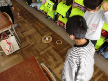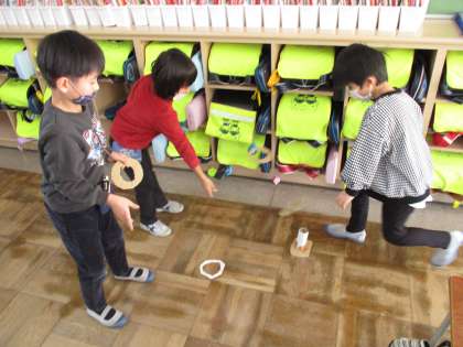 今日は久しぶりのしろがねタイムがありました。長い休み時間に遊ぶのはやっぱり楽しい様子でした。写真は工作係さんが作ってくれた輪投げで遊んでいる様子です。
