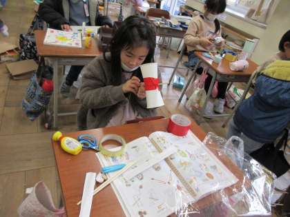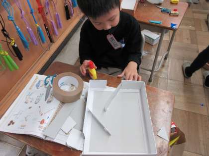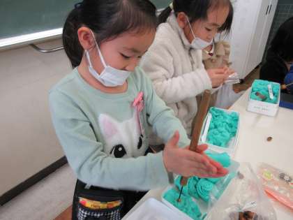 どんぐりごまや転がるおもちゃ、まつぼっくりのけん玉など、思い思いに作りました。完成したら、友達のおもちゃでも遊ばせてもらいたいですね。