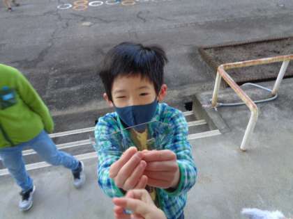 「先生、氷を見つけたよ!」と興奮気味に見せてくれました。朝晩の気温が下がり、今日は氷がはっているのを見つけたようです。寒かったけれど、氷を見つけたうれしさが勝っていたのか、とても楽しそうな朝でした。