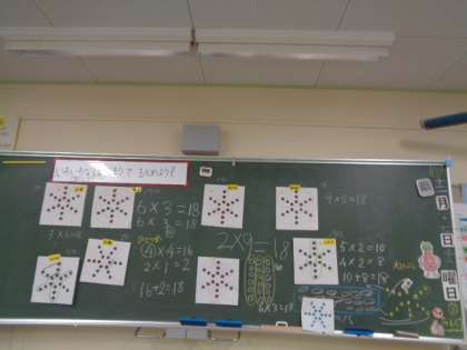 「おもしろかった〜」子供たちの口から出た言葉です。チョコレートの数を、九九をつかっていろいろな方法で求めました。一つ分が違うので何通りも求め方がでてきました。自分の思いつかないような考え方に出会う楽しさ、分かる楽しさを味わった1時間でした。