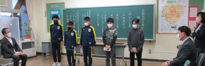 12月20日に、バドミントンやサッカーの全国大会に出場するみなさんの激励会が行われました。蜷川自治振興会長様から、激励のお言葉をいただいた後、一人一人が全国大会に向けての意気込みを話しました。全国大会へ出場される皆さんの健闘を祈っています。