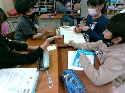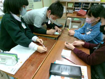 ゲームが終わった後、自分の陣地と相手の陣地の広さの比べ方の方法を考えました。ハサミで切って重ねて、はみ出した部分に注目したり、線を書き足してマスを細かくするなど、班のみんなで色々な考えを出し合って問題に取り組んでいました。