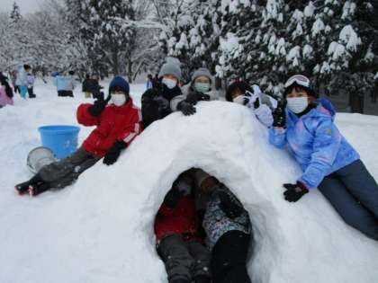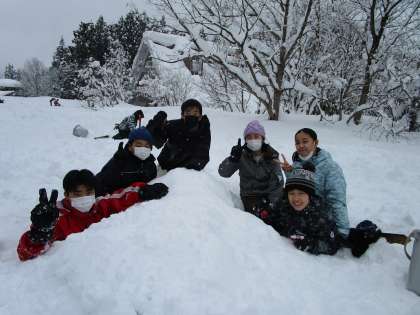 大きなかまくらの中に入っている子ども達。どんどん穴をほる子供もいました。みんな楽しんでいました。