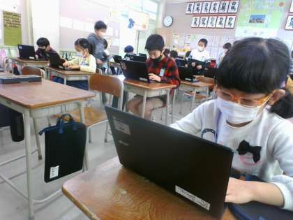 今日はまず、1組の子供たちがカメラマンや記者となって、ホームページをアップしました。