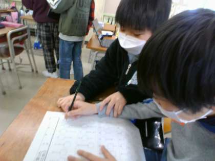 これは授業中のことです。優しく漢字を指で教えているところです。このクラスは温かく見守ってくれるクラスです。