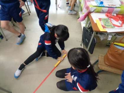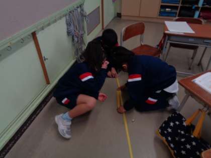 算数科では、「1m」を学習しました。1mものさしを使って、教室のいろいろなところを予想を立てて測ってみました。教室のたては、8mちかくあることが分かって、「長い!」と驚いていました。長さの量感が身に付いてきて、「ドアのたての長さは2mくらいかな」と話していた子供たちです。