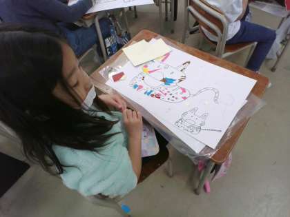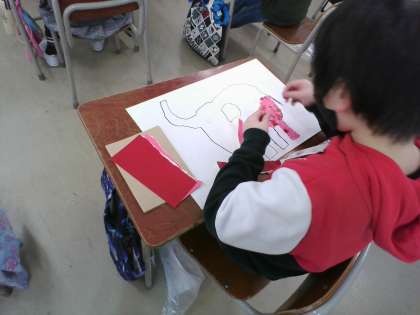 2年生は、シール版画を行っています。自分の好きな動物を描いて、カラフルなシールをちぎって貼っていきます。きれいにうつるように、隙間なく、小さくちぎって丁寧に貼っています。どれもすてきな作品になりそうです。