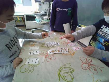 トランプでスピードをしているところです。火の粉バチバチのスピード勝負!! さて、勝負の行方は?