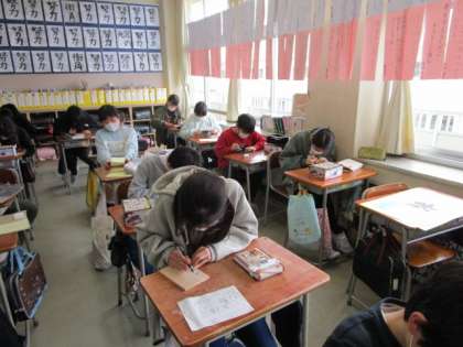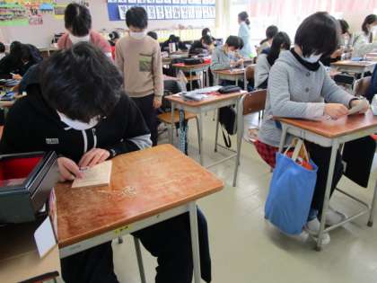 図画工作科の学習の様子です。卒業記念作品を製作しています。子供たちは、小物入れのふたの板部分に思い思いの絵を描き、彫刻刀を使って彫り進めています。子供たちは自分の作品と真剣に向き合い、よりよい作品にしようと懸命に取り組んでいました。仕上がりが楽しみです。