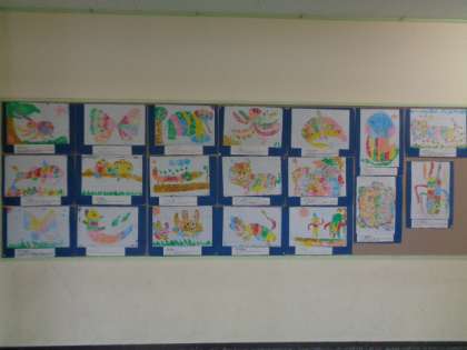 図画工作科の学習でつくった版画の作品が各教室の前に並んでいます。自分の好きな動物を色とりどりに表現しました。個性的な作品がとってもすてきです。