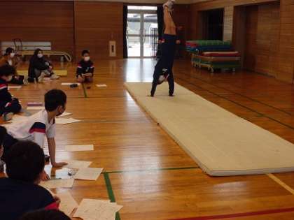 体育の学習で、マット運動に取り組んでいます。6年生の集大成として、大技4つに、つなぎとしてバランス技を組み合わせて全部で6種類の技を見せた発表会を行いました。倒立前転や側方回転、ハンドスプリング、ロンダード等、様々な難しい技にも挑戦し披露する子供もおり、「おお〜」と歓声が沸き上がり場面もあり、成長する姿が見られました。中学校でも、挑戦する気持ちを大切にしてほしいです。