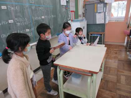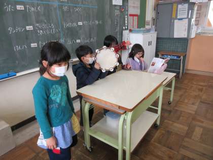 グループで何の楽器を演奏するか決め、「とんくるりん ぱんくるりん」を発表しました。体を揺らしながら歌ったり、自分で工夫して演奏したりするなど、とても楽しい演奏を聴かせてくれました。