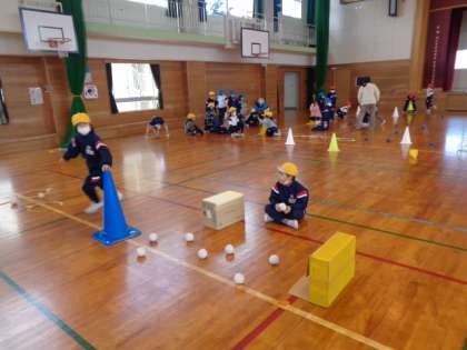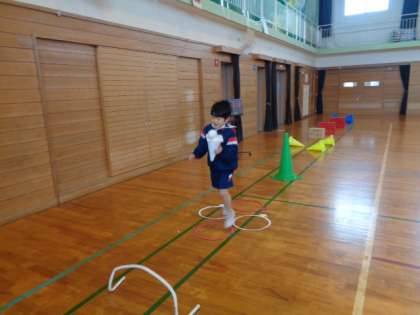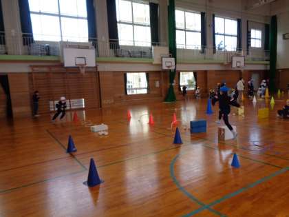 体育科では、リレーあそびをしています。コーンやミニハードル、ボール、段ボールなど様々な障害物を使ったり、障害物の感覚を変えたりして、チームごとに相談してコースを工夫しています。自分たちで試しながら、動きの中にジグザクやカーブを取り入れたり、他のチームのコースを跳んでみてよさを伝えあったりしながら、楽しく取り組んでいます。