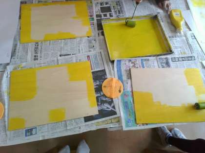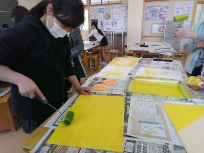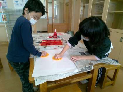 みんなと協力して自分の作品をより良くしようと、工夫して色を塗っています。