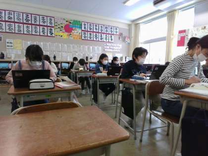 一つ目の写真は、分からない言葉を自分にあった方法で調べているところです。例えばクロームブックや国語辞典で調べています。