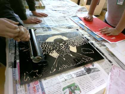 図工の時間に版画をすりました。ローラーで板に黒いインクを塗りました。ひとりひとりの個性的な作品ができました。