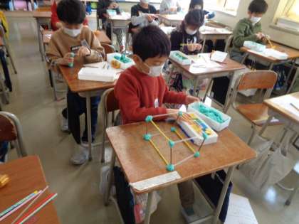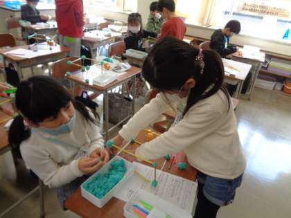 算数では、箱の形をたけひごと粘土をつかって表す学習をしました。辺がが12こ、頂点が8つあることがはっきりと分かり、子供たちは、「見えなかった辺が見えて、すっきり!」と言っていました。互いに教え合う姿が自然と見られ、仲良く学び合うことができました。