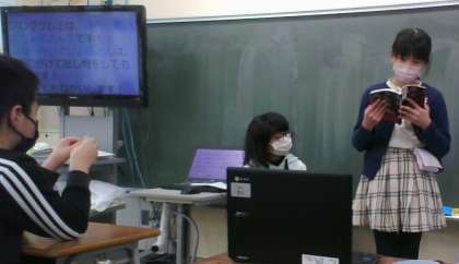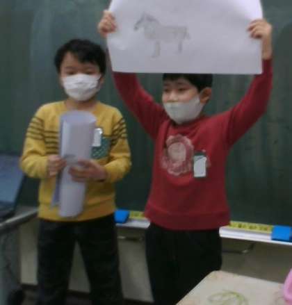4年生最後の集会をしています。怖い話を不気味にするホラー怖いでしょ係さん。誰かの顔を言い当てる遊びをイラストで作ってくれたイラスト係さん。楽しいクイズを作ってくれたクイズ係さん。集会お笑いからのサプライズイベントもありました。お笑いでは、4−4の1年間の思い出を楽しい感じに仕上げてくれました。遊び係さんは、密にならない楽しく遊べるリレーを考えてくれました。とっても楽しかったです。